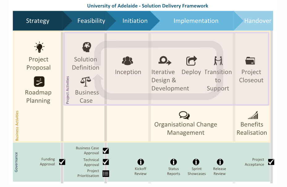 In conjunction with Business Owners, Technology staff determine the most appropriate solution delivery framework to meet the circumstances of each project being undertaken. While traditional Waterfall and Lean/Agile approaches are still used, increasingly a customised or hybrid approach is being adopted.