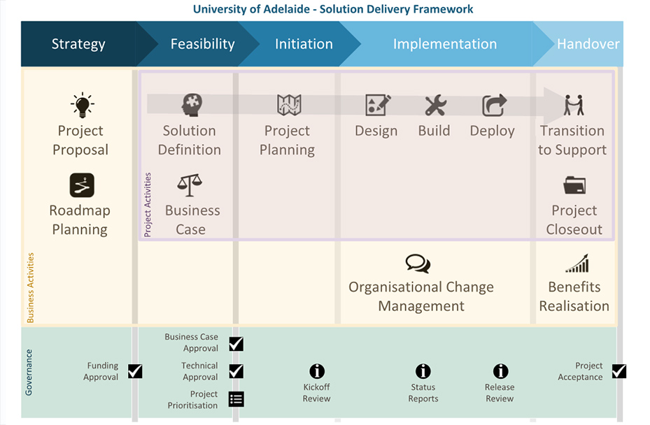 The projects within the Information Technology and Digital Services portfolio are established each year through a consultation process to align with the priorities, budget and strategic direction of the University. This typically results in a project portfolio with a whole variety of business needs, technologies, sizes and complexities. Technology can provide guidance on approach, methodologies and processes to best meet business need - scaling or adapting the project as required.